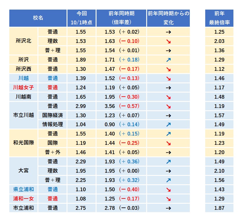 市立川越の普通科は定員数が少ないため、倍率ほど実人数が変動してはいないものです。